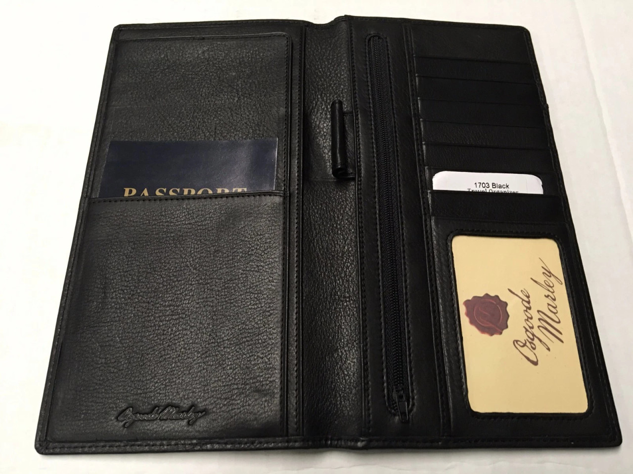 Convenience and organization. Plain front opens to divided sides. Left side features full height pocket with a separate leather layer on top for easy access when tucking away your plane or train ticket. Check in for your flights from home? Not a problem. The slot easily fits traditional printer sized paper folded into thirds. Passport easily gets tucked into the pocket on the front. Osgoode Marley signature logo embossed on center of base. Opposite side showcases the same full height pocket, a pen loop, a 7 ¾” zippered pocket, slots for 7 credit cards and 1 ID window pocket with a pocket on the underside. 4” easy slider pocket on the rear. We only wish it could reroute all of our flights right to Fiji.